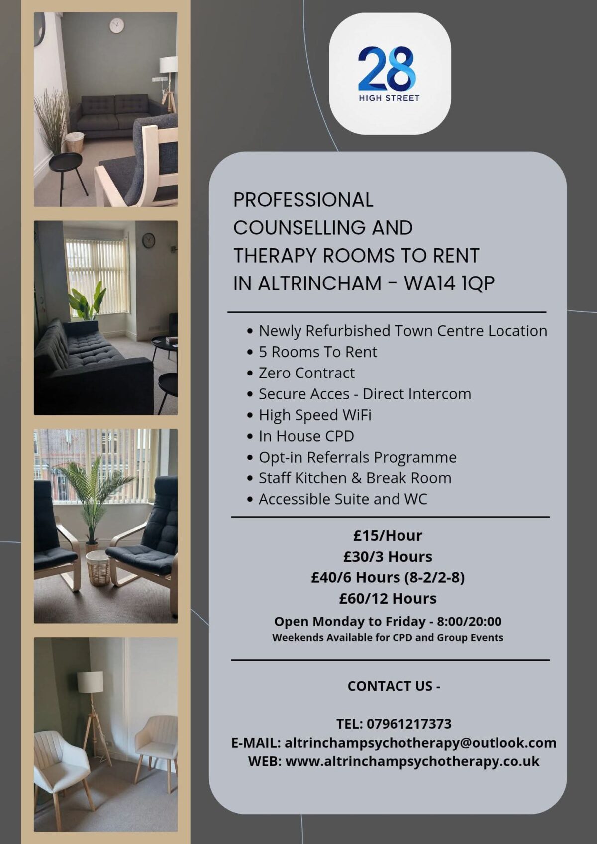 Located at 28 High Street, Altrincham, our newly refurbished counselling and therapy rooms offer a professional, welcoming space in the heart of the town centre. Ideal for counsellors, psychotherapists, and wellbeing practitioners seeking flexible, high-quality rooms without long-term contracts.